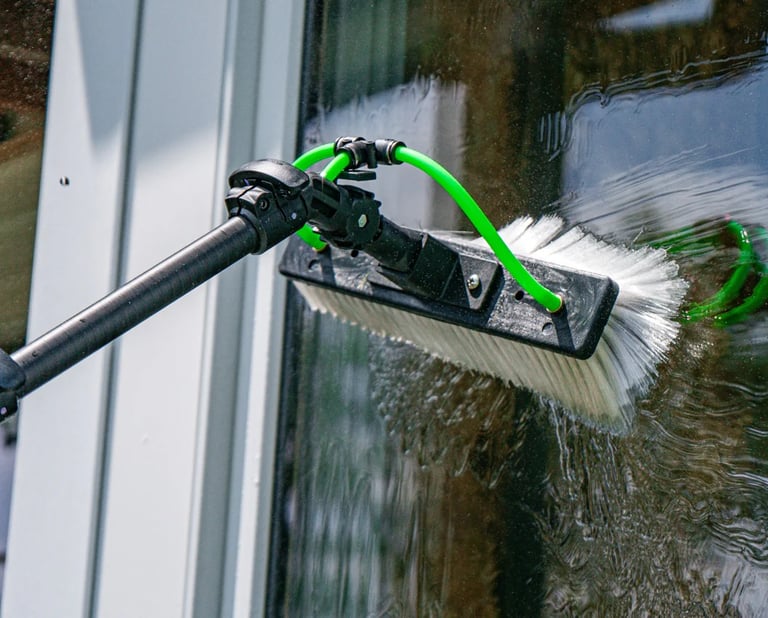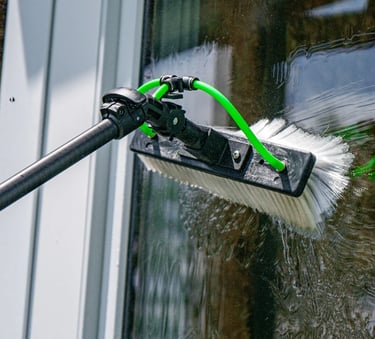 Safe & Efficient: Our water-fed pole system cleans your windows from the ground—no ladders or scaffolding needed—ensuring maximum safety for our team and your property.